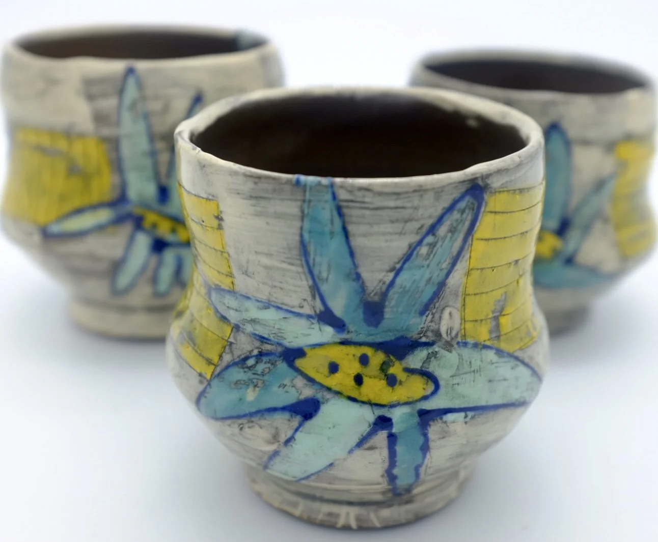 Flower tumbler, Cone 6, slip, monoprinted underglazes, and clear glaze