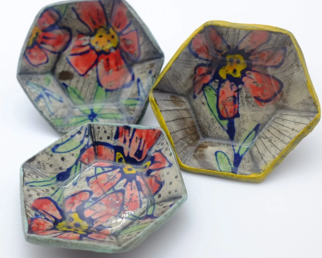 Flower dish, Cone 6, slip, monoprinted underglazes, and clear glaze